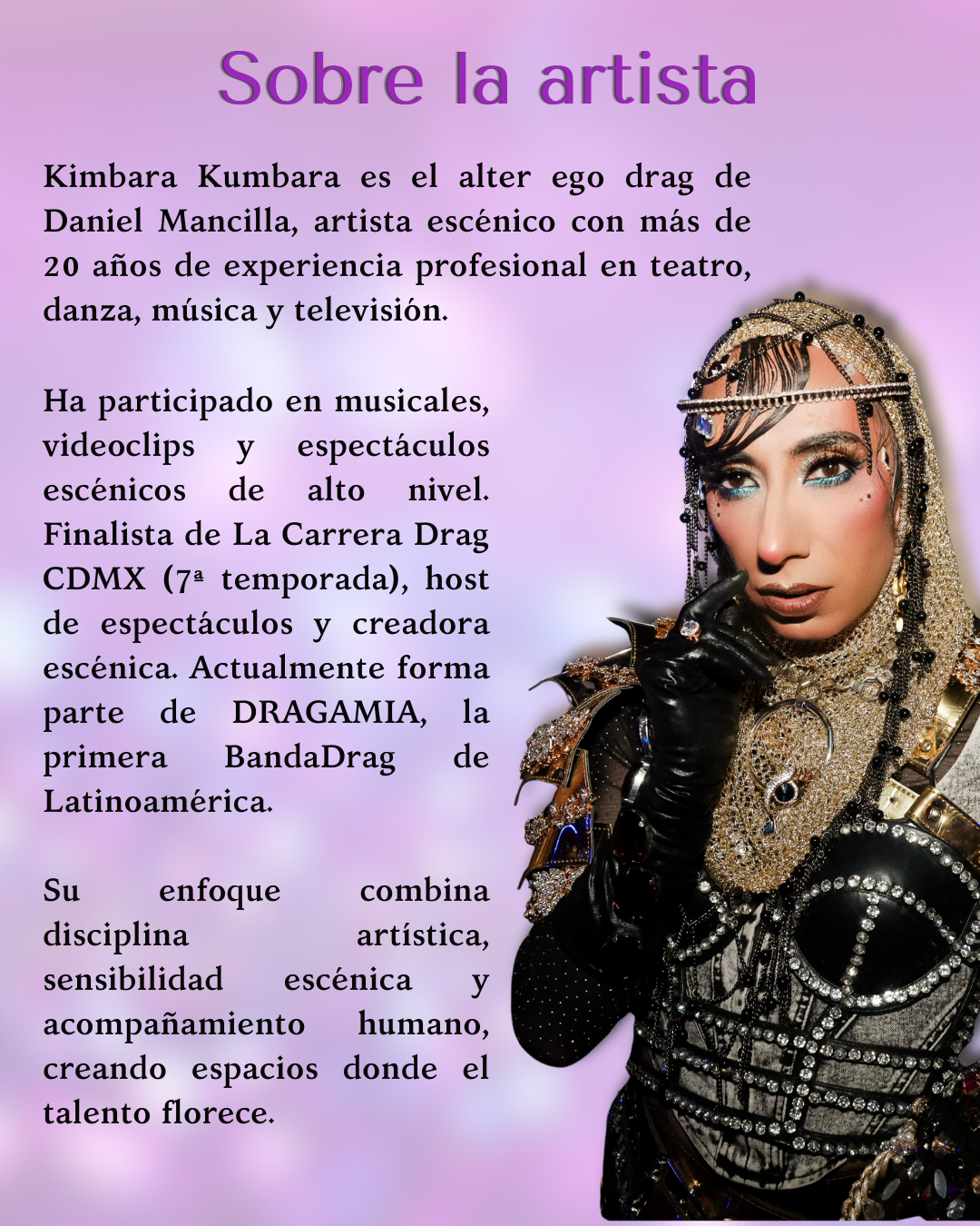 Kimbara Kumbara es el alter ego drag de Daniel Mancilla, artista escénico con más de 20 años de experiencia profesional en teatro, danza, música y televisión.