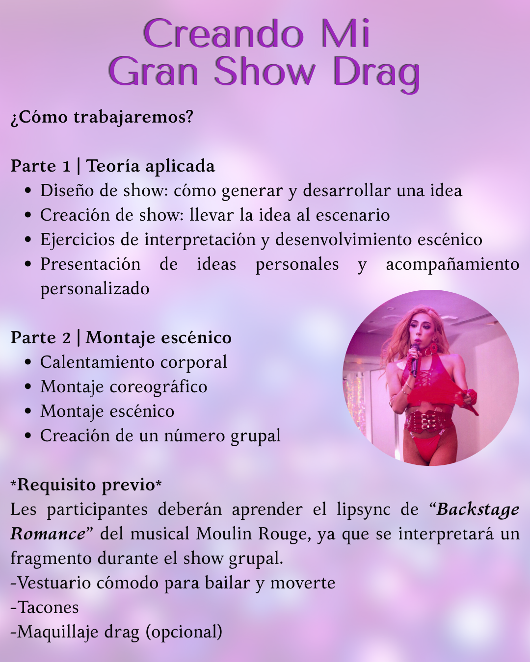 Esta masterclass presencial está pensada para artistas drag que desean llevar su show al siguiente nivel, integrando concepto, cuerpo, interpretación y puesta en escena en un solo acto poderoso.